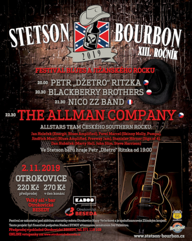 V sobotu 2. listopadu se v Otrokovické Besedě uskuteční už 13. ročník mezinárodního festivalu blues a jižanského rocku Stetson And Bourbon (momentka amerických Skinny Molly připomíná otrokovické vystoupení z loňského roku). Hlavní hvězdou večera bude domácí superskupina The Allman Company, která vznikla jako pocta legendární jižanské kapele Allman Brothers Band, jejíž půlstoletou kariéru loni uzavřela smrt jednoho ze zakládajících členů Gregga Allmana. Její pětičlenné obsazení tvoří zpěvák a varhaník Jan Holeček (Energit, Blues Amplified), kytaristé Pavel Marcel (ex-Pumpa, Skinny Molly) a Jindřich Musil (Blues Amplified, Freeway Jam), baskytarista Stanislav Hörner (Sign of 4) a bubeník Dan Hubáček (Marty Hall, John Slim, Steve Harrison). Letošní přehlídku ve Velkém sále zahájí ve 20 hodin svérázný slezský bluesman Petr „Džetro“ Ritzka, jehož v půl deváté vystřídá polská southernrocková kapela Blackberry Brothers, která je podle hlasování žánrového magazínu Twoj blues u našich sousedů Objevem roku 2018. Ve 21:30 nastoupí s hodinovým blokem slavný francouzský Nico ZZ Band a finále tradiční akce bude patřit už zmíněné formaci The Allman Company.