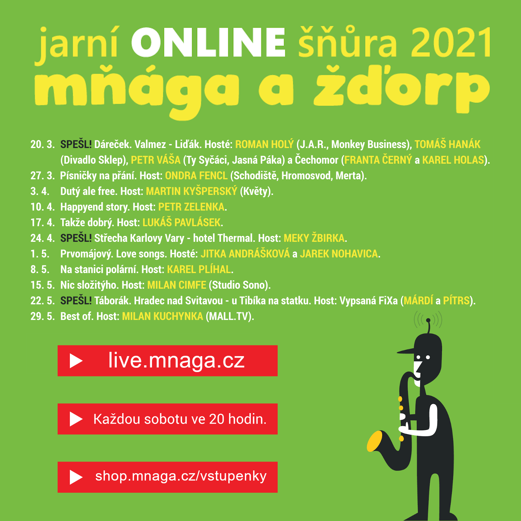 Jarní online šňůru kapela odstartuje v sobotu 20. 3. speciálním koncertem v Liďáku ve Valašském Meziříčí. Spolu s Mňágou vystoupí i Franta Černý a Karel Holas z Čechomoru, Roman Holý, Petr Váša a Tomáš Hanák. „Bude to takovej malej fesťáček na úvod. Určitě zazní Strom kýve pahýly a další kousky z repertoáru našich hostů,” přibližuje detaily Petr Fiala. Takzvané Spešl koncerty proběhnou ještě dva – 24. dubna na střeše hotelu Thermal v Karlových Varech s Meky Žbirkou a 22. května na statku u saxofonisty Tibíka v Hradci nad Svitavou s Vypsanou fiXou.