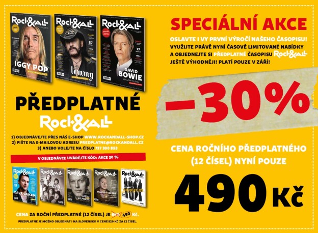 Časopis ROCK & ALL začal vycházet v srpnu loňského roku a rychle se etabloval na poměrně saturovaném trhu zaměřeném na populární hudbu. Po roce k základnímu titulu přidává ještě Hudební noviny, jejichž první číslo vychází právě dnes (vice ZDE). Pro čtenáře časopisu ROCK & ALL přichází tento měsíc při příležitost zahájení druhého roku fungování speciální časově omezená nabídka. Během září si mohou fanoušci objednat předplatné časopisu za výrazně sníženou cenu. Z původních 690 Kč za 12 výtisků 100stránkového magazínu musí fanoušek výjimečně vytáhnout z peněženky pouze 490 Kč! Svým předplatitelům a našim fanouškům tak nabízíme bezkonkurenční cenu 41 Kč místo 80 Kč v přímém prodeji. Navíc vám ho doveze pošťák i do obcí, kde ho normálně na stánku nedostanete. Ne, už nebudeme dále přemlouvat, tak či onak pro vás tým Rock & All chystá na začátek listopadu další příjemné překvapení. Ale o tom si povíme opravdu až za pár týdnů.