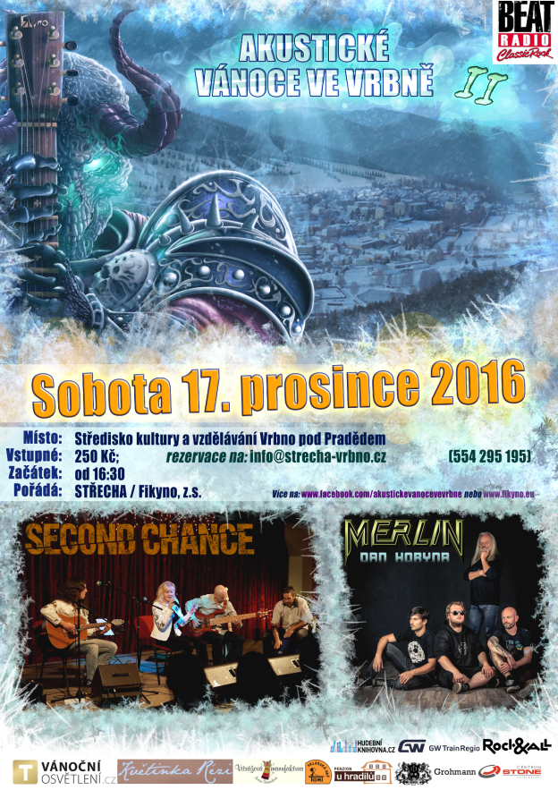 Středisko kultury a vzdělávání Vrbno – Střecha ve spolupráci s kulturním spolkem Fikyno zve fanoušky rockové muziky na druhý ročník Akustických Vánoc ve Vrbně, který se uskuteční 17. prosince 2016 ve Vrbně pod Pradědem.
